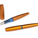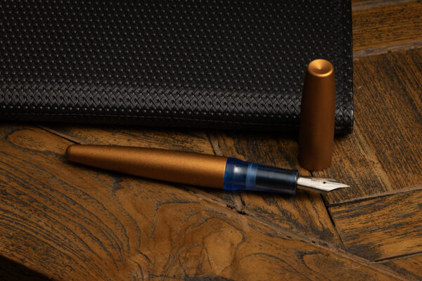 The Copperhead Orange Vertex is our snap-cap fountain pen perfect for pocket carry. This colorway is accomplished by our Cerakote applicator working his magic with some FX-115 Copper Cerakote. The website calls this color a “rich copper metallic” however, that’s not really the case, and while there are copper tones in the finish, it leans heavily into the orange category. Copperhead Orange is a far better name for this color as it sparkles with a copper brilliance as it shifts from bright orange to a rich orange depending on the light. We suggest pairing this with one of our many contrasting color options like transparent blue or transparent smoke, but you’ll have complete access to ALL of our currently available aluminum and Makrolon grip sections. Select from wide variety of polished steel nibs to further customize your pen to your specifications. Ships in our recyclable packaging with a custom vinyl sticker. The Vertex fountain pen is the latest step in our Design.History.Technology influenced Signature Series.